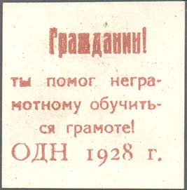 1928 1928 г. Разм. 44 х 44 мм. Одноцветная печать гладкой белой бумаге. В центре текст в пять строк: «Гражданин! Ты помог неграмотному обучиться грамоте! ОДН 1928 г.».