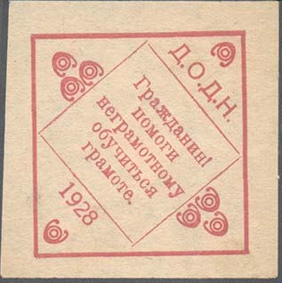 1928 1928 г. Ромб разм. 74 х 74 мм. Одноцветная печать на тонкой желтоватой бумаге. В центре в ромбовидную рамку разм. 60 х 60 мм вписана дополнительная прямоугольная рамка. В центре прямоугольной рамки текст в пять строк: «Гражданин! Помоги неграмотному обучиться грамоте!». Сверху аббревиатура: «Д.О.Н.Д.» и декоративный элемент. Слева и справа по три декоративных элемента. Внизу дата: «1928» и декоративный элемент.