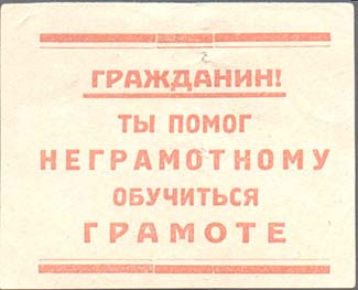 1928 1928(?) г. Разм. 55 х 44 мм. Одноцветная печать гладкой белой бумаге. В центре двойными горизонтальными линиями текст в пять строк: «Гражданин! Ты помог неграмотному обучиться грамоте».