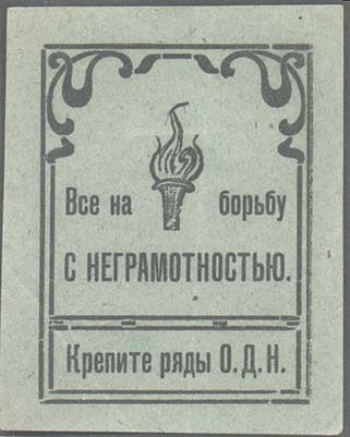 1930 1930(?) г. Разм. 53 х 66 мм. Одноцветная печать на зелено-серой бумаге. В прямоугольной рамке разм. 42 х 56 мм с декоративным орнаментом в верхних углах в центре факел и текст в две строки: «Все на борьбу с неграмотностью». Внизу текст: «Крепите ряды О.Д.Н.».