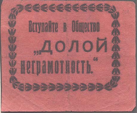1930 1930(?) г. Разм. 71 х 63 мм. Одноцветная печать на тонкой розово-красной бумаге. В прямоугольной с за-кругленными углами рамке разм. 63 х 50 мм из растительного орнамента текст в три строки: «Вступайте в Общество «Долой неграмотность»».