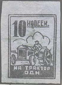 1930 1930(?) г. Разм. 34 х 47 мм. Одноцветная печать на тонкой серо-зеленой бумаге. В двойной прямоугольной рамке разм. 27 х 36 мм трактор в поле. Сверху номинал. Внизу текст в две строки: «На трактор ОДН».