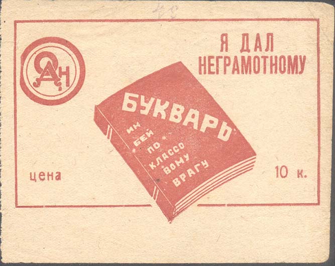 1930 1930(?) г. Листок из квитанционной книжки разм. 111 х 88 мм. Левосторонняя нерегулярная зубц. В центре в прямоугольной рамке разм. 102 х 63 мм букварь, на обложке которого текст в семь строк: «Букварь. Им бей по классовому врагу». В левом верхнем углу в двойной круглой рамке диаметром 23 мм аббревиатура «ОДН». В правом верхнем углу текст в две строки: «Я дал неграмотному букварь». Внизу текст: «Цена 10 к.».