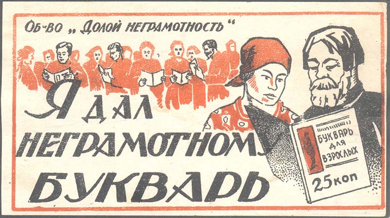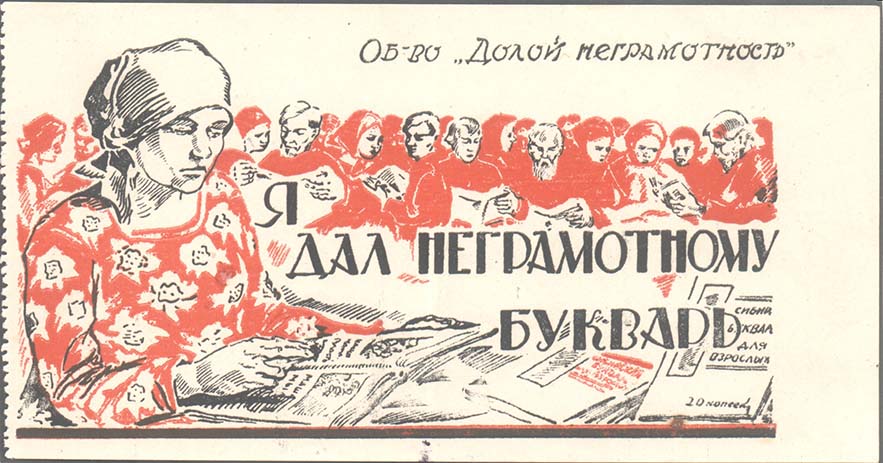 1930 1930(?) г. Листок разм. 133 х 74 мм. Двухцветная печать на белой бумаге. В прямоугольной рамке разм. 129 х 68 мм справа мужчина и женщина, читающие букварь для взрослых. Слева на заднем плане читающие люди. В левом верхнем углу текст: «Об-во «Долой неграмотность»». В левом нижнем углу текст в три строки: «Я дал неграмотному букварь».