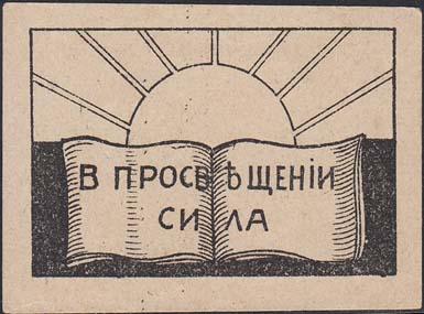 1917 1917(?) г. Разм. рамки 56 х 38 мм. Одноцветная печать на светло-серой бумаге. В прямоугольной рамке в центре раскрытая книга на фоне восходящего солнца. На развороте книги текст в две строки: «В просвещении сила».