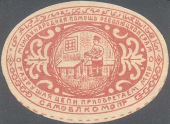 1924 1924 г. 20.04.1924 г. Виньетка в форме овала разм. 60 х 40 мм. Одноцветная печать на плотной желтоватой бумаге. В центре тройной овальной декоративной рамке разм. 54 х 37 мм заключенный в тюремной камере. По периметру рамки текст на русском и узбекском (арабским шрифтом) языках: «Международная помощь революционерам. Разрушая цепи приобретаем мир. Самоблкомопр».
