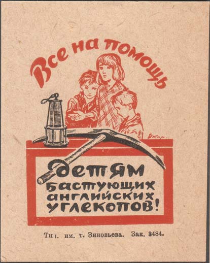 1926 1926 г. Разм. 68 х 86 мм. Двухцветная печать на толстой светло-бежевой бумаге. В центре трое детей, кирка и лампа. Сверху полукругом текст: «Все на помощь». Внизу в прямоугольной рамке продолжение текста в четыре строки: «Детям бастующих английских углекопов». Внизу мелким шрифтом выходные данные: «Тип. им. т. Зиновьева. Зак. 3484».