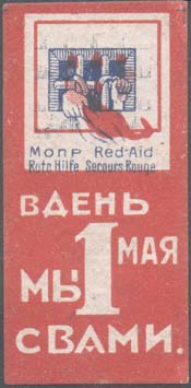 1929 1929 г. 01.05.1929 г. Разм. 28 х 58 мм. Двухцветная печать на желтоватой бумаге с мелованным верхним слоем. Сверху в прямоугольной рамке разм. 22,5 х 22,5 мм эмблема МОПР. Внизу под эмблемой аббревиатура: «МОПР» на русском, английском, немецком и французском языках. Внизу текст четыре строки: «В день 1 мая мы с вами».