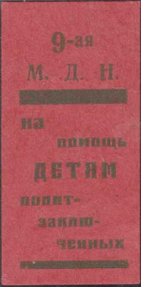 1929 1929 г. Разм. 28 х 60 мм. Одноцветная печать на бумаге различного качества и цветов. В центре текст в шесть строк: «На помощь детям политзаключенных». Сверху текст в две строки: «9-ая М.Д.Н.».