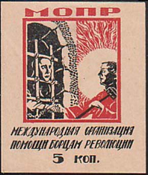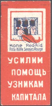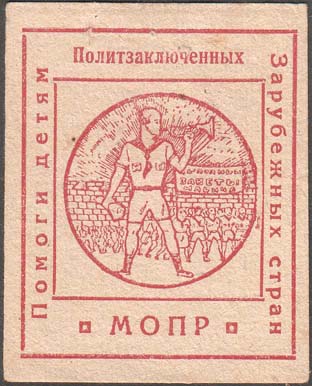 1930 1930(?) г. Разм. 53 х 63 мм. Одноцветная печать на плотной желтоватой бумаге низкого качества. В центре двойной прямоугольной рамке 46 х 55 мм дополнительная круглая рамка диаметром 33 мм. В круглой рамке пионер с горном на фоне демонстрации. По периметру между рамками текст: «Помогите детям Политзаключенных Зарубежных стран. МОПР».
