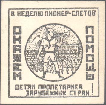 1930 1930(?) г. Разм. 59 х 58 мм. Одноцветная печать на плотной бумаге различного качества. В центре прямоугольной рамке 51 х 50 мм дополнительная круглая рамка диаметром 33 мм. В круглой рамке пионер с горном на фоне демонстрации. По внутреннему периметру прямоугольной рамки текст: «В неделю пионер-слетов окажем помощь детям пролетариев зарубежных стран!».