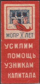 1932 1932 г. Разм. 28 х 58 мм. Двухцветная печать на желтоватой бумаге с мелованным верхним слоем. Сверху в прямоугольной рамке разм. 22,5 х 22,5 мм эмблема МОПР. Внизу под эмблемой текст: «МОПР X лет». Внизу текст четыре строки: «Усилим помощь узникам капитала».