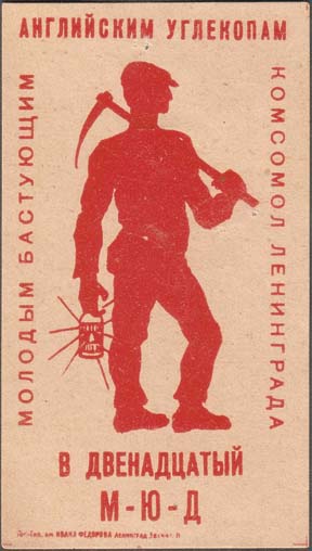 1926 1926 г. Разм. 48 х 85 мм. Одноцветная печать на желто-серой бумаге. В центре силуэт шахтера с киркой и лампой. По периметру текст: «Молодым бастующим английским углекопам комсомол Ленинграда. В двенадцатый М-Ю-Д». Слева внизу мелким шрифтом выходные данные: «Гос. тип. им. Ивана Федорова Ленинград Звениг. 11».