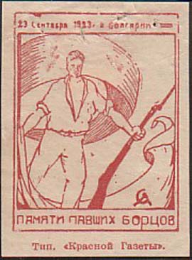 1923 1923 г. Разм. 45 х 61 мм. Одноцветная печать на кремовой бумаге. В центре в прямоугольной рамке разм. 39 х 51 мм рабочий с развевающимся знаменем в одной руке и винтовкой в другой. Сверху текст: «23 сентября 1923 г. в Болгарии». Внизу текст: «Памяти павших борцов». Внизу мелким шрифтом выходные данные: «Тип. «Красной Газеты»».