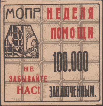 1924 1924 г. 01.12.1924 г. Разм. рамки 56 х 56 мм. Трехцветная печать на кремовой бумаге. В прямоугольной рамке с закругленными краями на фоне в виде тюремной решетки слева эмблема МОПР. Слева сверху аббревиатура «МОПР». Слева внизу текст в три строки: «Не забывайте нас!». Справа текст в четыре строки: «Неделя помощи 100.000 заключенным». По углам знака разграничительные линии.