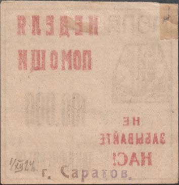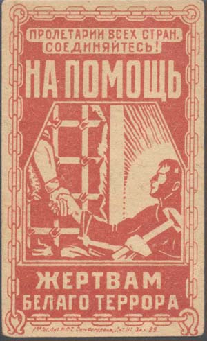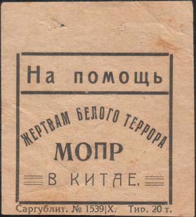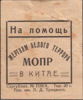 1927 1927 г. 01.05.1927 г. Разм. 46 х 56 мм. Одноцветная печать на желтоватой бумаге. В прямоугольной рамке разм. 37 х 35 мм в центре текст в четыре строки: «На помощь жертвам белого террора в Китае». Внизу под рамкой выходные данные мелким шрифтом: «Саргублит. №1539 X. Тир 20 т. Тип. Им. Л.Д. Троцкого».