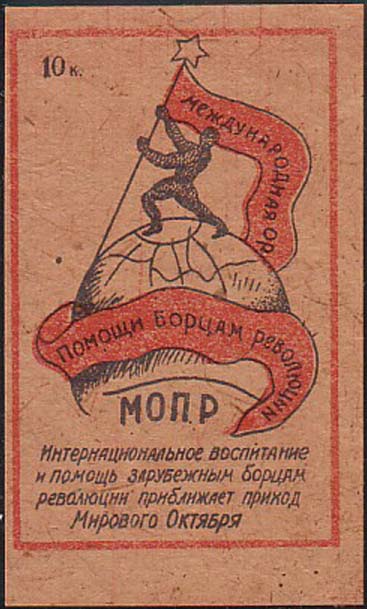 1932 1932 г. 05.09.1932 г. Листок разм. 100 х 63 мм. Двухцветная печать на желто-коричневой бумаге низкого качества. В прямоугольной рамке разм. 55 х 87 мм в центре аллегорический рисунок: фигура рабочего со знаменем на вершине земного шара. На полотнище знамени текст: «Международная помощь борцам революции». Ниже аббревиатура «МОПР». В левом верхнем углу номинал. Внизу текст в четыре строки: «Интернациональное воспитание и помощь зарубежным борцам революции приближает приход Мирового Октября».