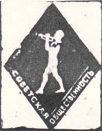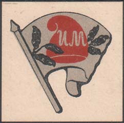 1920 1920(?) г. Разм. 40 х 39 мм. Трехцветная печать на плотной белой бумаге. В центре ранний вариант комсомольского значка: знамя, на полотнище которого фригийский колпак с буквами «ИМ» и лавровые ветви.