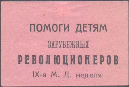 1929 1929 г. 26.05.1929 г. Разм. 69 х 46 мм. Одноцветная печать на розовой бумаге. В центре текст в четыре строки: «Помоги детям зарубежных революционеров IX-я М.Д. неделя».