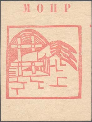1930 1930(?) г. Разм. 52 х 70 мм. Одноцветная печать на желтоватой бумаге. В центре в прямоугольной рамке разм. 40 х 40 мм эмблема МОПР. Сверху аббревиатура: «МОПР».