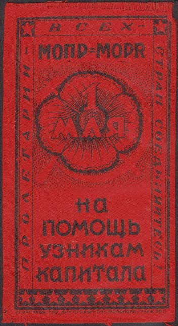 1930 1930(?) г. Разм. рамки 42 х 97 мм. Одноцветная печать на материи красного цвета. В двойной прямоугольной рамке в центре цветок мака на фоне серпа и молота. На цветке текст в две строки: «1 мая». Сверху аббревиатура «МОПР-МОРR». Внизу текст в четыре строки: «На помощь узникам капитала». По периметру между рамками текст: «Пролетарии всех стран соединяйтесь!». Меду рамками внизу и по углам пятиконечные звезды. Внизу под рамкой выходные данные мелким шрифтом: «Кр. Лит. 4099, т-во «Литограф», Симферополь, тираж 30 т.».