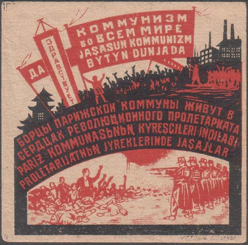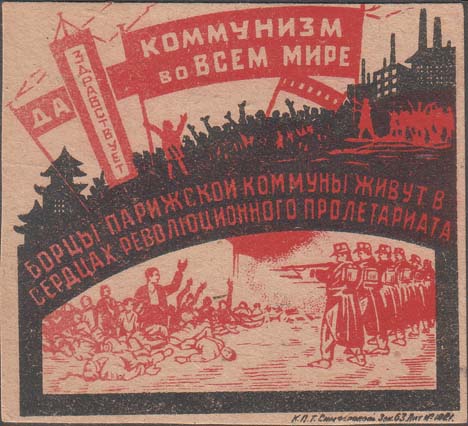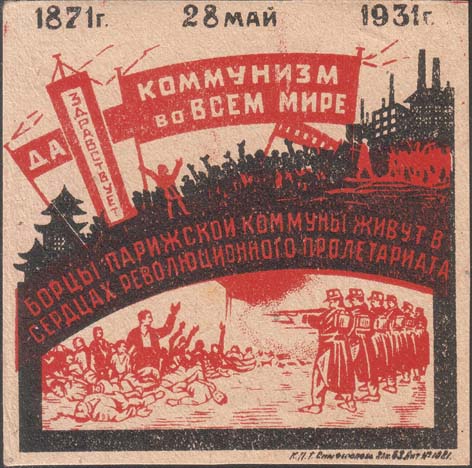 1931 1931 г. 28.05.1931 г. Разм. 82 х 80 мм. Разм. рисунка 76 х 76 мм. Двухцветная печать на сероватой бумаге низкого качества. Сверху демонстрация рабочих на фоне городских пейзажей. На транспарантах текст на двух языках: «Да здравствует коммунизм во всем мире». Внизу сцена расстрела героев Парижской коммуны. В центре между рисунками текст на двух языках: «Борцы парижской коммуны живут в сердцах революционного пролетариата». Внизу справа под рамкой мелким шрифтом выходные данные: «К.П.Т. Симф. Лит. №502».