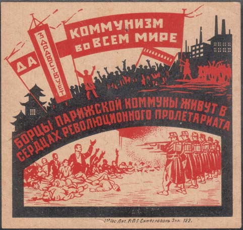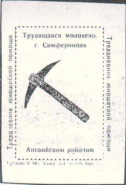 1926 1926(?) г. Разм. 66 x 89 мм. Одноцветная печать на белой бумаге. В прямоугольной пунктирной рамке разм. 50 x 72,5 мм в центре кирка. Сверху текст в две строки: «Трудящаяся молодежь г. Симферополя!». Внизу продолжение текста: «Английским рабочим». По бокам снаружи рамки вертикально текст: «Трехдневник юношеской помощи». Внизу под рамкой выходные данные мелким шрифтом: «Крымлит. №3367. Симф. 1-609. Тир.5000».