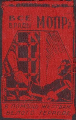1931 1931 г. 01.09.1931 г. Разм. 40 х 62 мм. Одноцветная печать на материи красного цвета (оттенки). В центре эмблема МОПР. Верху текст в две строки: «Все в ряды МОПРа». Внизу текст в две строки: «В помощь жертвам белого террора».