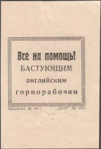 1926 1926 г. Разм. рамки 44 х 40 мм. Одноцветная печать на бумаге различных цветов и качества. В тройной прямоугольной рамке текст в три строки: «Все на помощь! Бастующим английским горнорабочим». Под рамкой мелким шрифтом выходные данные: «Крымлит №3861 «КПТ» №4521».