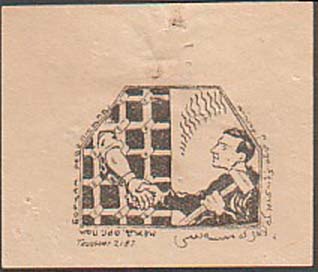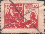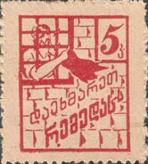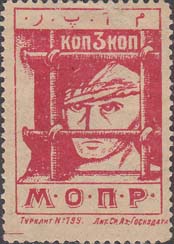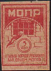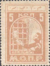 1925 1925(?) г. Разм. рамки 20 х 25 мм. Одноцветная печать на белой бумаге. Зубц. 11 1/2. С клеем. 54 х 60 мм. В прямоугольной рамке эмблема МОПР. В правом верхнем углу номинал. Внизу по диагонали текст в две строки на грузинском языке: «Разобьем цепи».