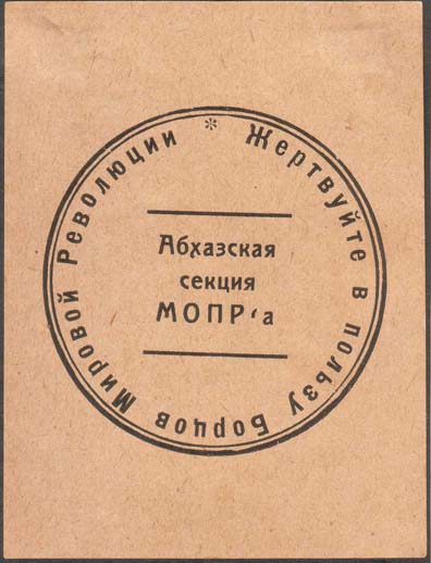 1931 1931(?) г. Разм. 66 х 86 мм. Одноцветная печать на плотной бумаге различных цветов. В центре в двойной круглой рамке диаметром 53 мм между двух горизонтальных линий текст в три строки: «Абхазская секция МОПРа». По внутреннему периметру круглой рамки текст: «Жертвуйте в пользу Борцов Мировой Революции» и декоративный элемент.