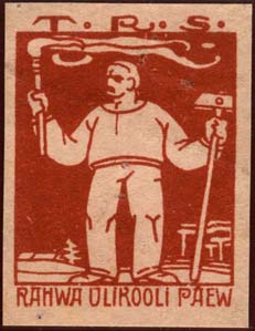 1917 1917 г. 19-20.08.1917 г. Разм. рамки 33 х 38 мм. Одноцветная печать на желтоватой бумаге. В прямоугольной рамке в центре рабочий с горящим факелом и молотом. Сверху аббревиатура на эстонском языке: «T.R.S.». Внизу текст на эстонском языке.