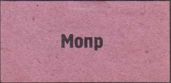 1930 1930(?) г. Разм. 58 х 28 мм. Одноцветная печать на серо-фиолетовой бумаге. В центре аббревиатура «МОПР».
