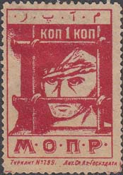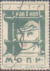 1927 1927(?) г. Одноцветная печать на белой бумаге. Нерегулярная зубц. С клеем. В прямоугольной рамке разм. 20 х 14,5 мм эмблема МОПР. В верхних углах номинал.