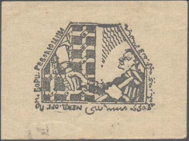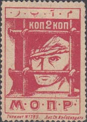 1930 1930(?) г. Разм. 64 х 46 мм. Одноцветная печать на желтоватой бумаге. В центре в пятиугольной рамке разм. 36 х 28 мм эмблема МОПР. По пери-метру рамки тест на русском и узбекском (арабским шрифтом) языках: «Межд[ународная]. Орг[анизация]. Пом[ощи]. Борц[ам]. Революции».