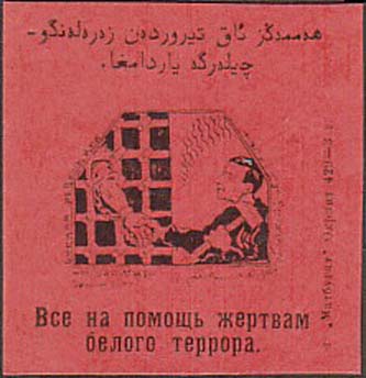 1928 1928 г. 23.03.1928 г. Разм. 55 х 57 мм. Одноцветная печать на толстой ярко-красной бумаге. В центре эмблема МОПР. По периметру рамки тест на русском и узбекском языке арабским шрифтом: «Межд[ународная]. Орг[анизация]. Пом[ощи]. Борц[ам]. Революции». Сверху текст в две строки на узбекском языке арабским шрифтом. Внизу текст в две строки: «Все на помощь жертвам белого террора». Справа вертикально снизу вверх выходные данные мелким шрифтом: «Т. «Матбугат» Окрлит 429-3 т.».