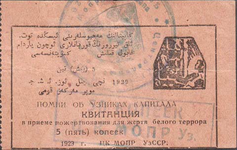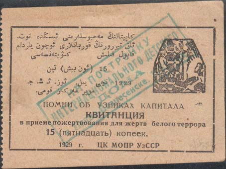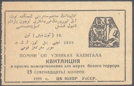 1929 1929 г. Листок из квитанционной книжки разм. 78 х 50 мм. Одноцветная печать на бумаге различных цветов. Левосторонняя нерегулярная зубц. В прямоугольной рамке разм. 71 х 42 мм в центре текст в пять строк: «Помни об узниках капитала. Квитанция в приеме пожертвования для жертв белого террора ...(номинал цифрами и прописью) копеек 1929 г. ЦК МОПР УзССР». Левом верхнем углу текст в шесть строк на узбекском языке арабским шрифтом. В правом верхнем углу эмблема МОПР.