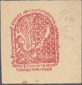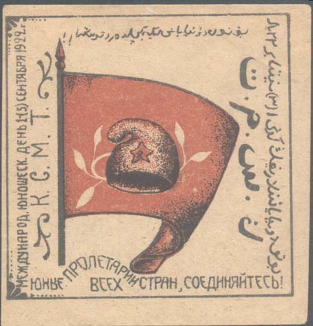 1922 1922 г. 01.-05.09.1922 г. Разм. 76 х 78 мм. Двухцветная печать на желтоватой бумаге. В центре в прямоугольной рамке разм. 70 х 69 мм красный флаг с фригийским колпаком в центре. Слева вертикально текст в две строки: «Международ[ный]. Юношеск[ий]. День 1- (5) сентября 1922 г. К.С.М.Т.». Внизу текст: «Юные пролетарии всех стран, соединяйтесь!». Справа и сверху текст на узбекском языке арабским шрифтом.