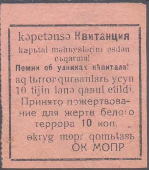 1931 1931 г. Август. Листок из квитанционной книжки разм. 50 х 57 мм. Одноцветная печать на тонкой розово-серой бумаге. Левосторонняя нерегулярная зубц. В центре в прямоугольной рамке разм. 46 х 47 мм текст на русском и узбекском (латинской шрифтом) языках: «Квитанция. Помни об узниках капитала! Принято пожертвование для жертв белого террора 10 коп. ОК МОПР».