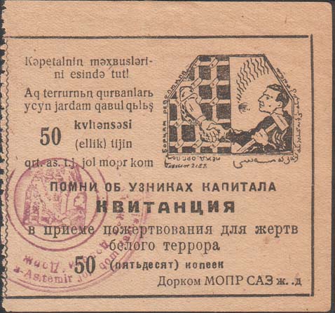 1932 1932 г. Листок из квитанционной книжки разм. 80 х 75 мм. Одноцветная печать на желтоватой бумаге. Левосторонняя нерегулярная зубц. В прямоугольной рамке разм. 74 х 62 мм в центре текст в шесть строк: «Помни об узниках капитала. Квитанция в приеме пожертвования для жертв белого террора ... копеек. Дорком МОПР САЗ. ж.д.». В правом верхнем углу эмблема МОПР. Слева текст на узбекском языке латинским шрифтом в семь строк. На лицевой стороне оттиски круглой контрольной печати чернилами различных цветов.