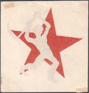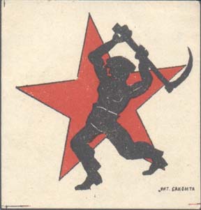 1926 1926 г. Разм. 49 х 49 мм. Двухцветная печать на белой бумаге. В центре на фоне пятиконечной звезды силуэт рабочего с занесенной для удара киркой. Справа внизу мелким шрифтом выходные данные: «Лит. Сакомта». По углам знака разграничительные линии.