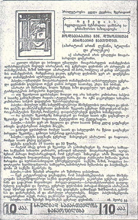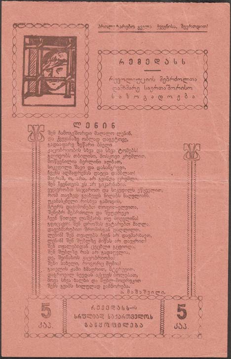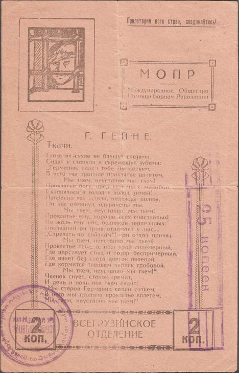 1924 1924 г. Одноцветная печать на бумаге различных цветов. В центре различные тексты. В левом верхнем узник за тюремной решеткой. В правом верхнем углу текст: «Пролетарии вех стран, соединяйтесь!». Справа ниже в декоративной рамке текст в три строки: «МОПР. Международное Общество Помощи Борцам Революции». Внизу в декоративной рамке номинал и текст: «Всегрузинское отделение».