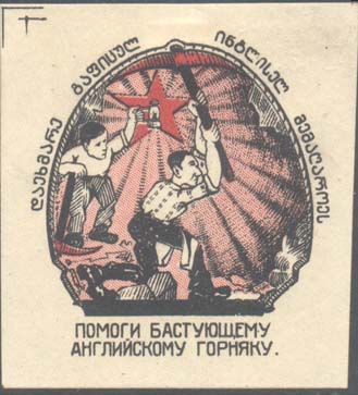 1926 1926 г. Разм. 54 х 60 мм. Двухцветная печать на плотной различных цветов и качества. В центре в рамке сложной формы двое шахтеров в шахте за работой. Сверху полукругом текст на грузинском языке. Внизу текст в две строки: «Помоги бастующему английскому горняку». По углам знака разграничительные линии.
