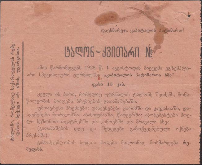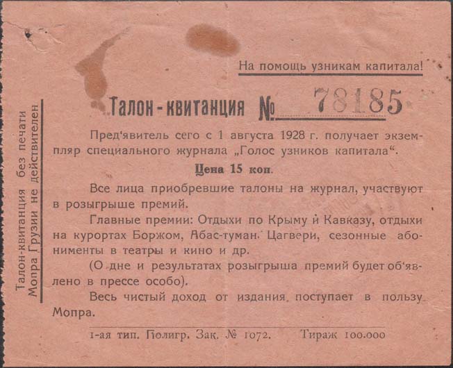 1928 1928 г. 01.08.1928 г. Листок из квитанционной книжки разм. 110 х 88 мм. Одноцветная двухсторонняя печать на розово-серой бумаге. Левосторонняя нерегулярная зубц. на лицевой стороне текст в тринадцать строк: «Талон-квитанция № ... Предъявитель сего с 1 августа 1928 г. Получает экземпляр специального журнала «Голос узников капитала». Цена 15 коп. Все лица приобревшие талоны на журнал, участвуют в розыгрыше премий. Главные премии: Отдыхи по Крыму и Кавказу, отдыхи на курортах Боржом, Абас-туман, Цагвери, сезонные абонементы в театры кино и др. (О дне и результатах розыгрыша премий будет объявлено в прессе особо). Весь чистый доход от издания поступает в пользу Мопра». В правом верхнем углу текст с подчеркиванием: «На помощь узникам капитала!». Слева вертикально в текст в две строки: «Талон-квитанция без печати Мопра Грузии не действителен». Внизу под чертой мелким шрифтом выходные данные: «1-ая тип. Полигр. Зак. №1072. Тираж 100.000». На оборотной стороне текст на грузинском языке.
