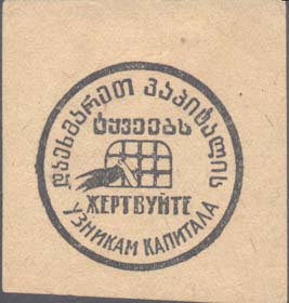 1930 1930(?) г. Разм. 44 х 45 мм. Одноцветная печать на бумаге различных цветов. В центре в круглой рамке диаметром 32 мм эмблема МОПР. Сверху с внутренней стороны рамки полукругом текст в две строки на грузинском языке. Внизу с внутренней стороны рамки полукругом текст в две строки: «Жертвуйте узникам капитала».