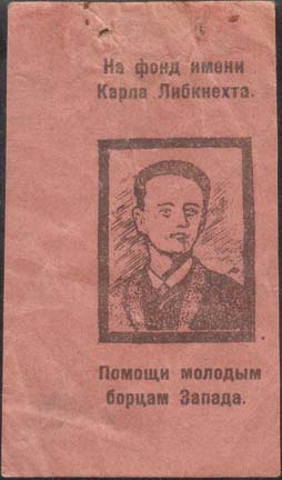 1920 1920(?) г. Разм. 41 х 71 мм. Одноцветная печать на розовато-серой бумаге. В центре в прямоугольной рамке разм. 24 х 31 портрет К.Либкнехта. Сверху текст в две строки: «На фонд имени Карла Либкнехта». Внизу продолжение текста в две строки: «Помощи молодым борцам Запада».