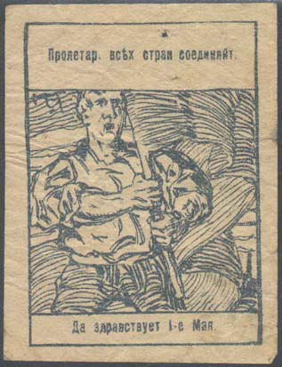 1924 1924(?) г. Разм. рамки 44 х 61 мм. Одноцветная печать на тонкой серой бумаге. В прямоугольной рамке в центре рабочий со знаменем. На заднем плане завод. Сверху текст: «Пролетар[ии]. всех стран соединяйт[есь]». Внизу текст: «Да здравствует 1-е мая».