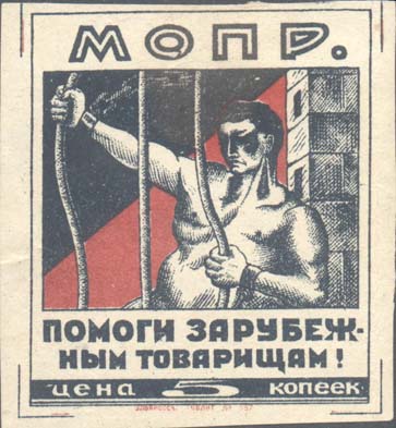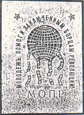1928 1928(?) г. Разм. 49 x 66 мм. Одноцветная печать на серовато-розовой бумаге. В центре аллегорический рисунок: символическое изображение земного шара с падающими цепями. По периметру текст: «Молодежь, помоги заключенным борцам революции! МОПР». В верхних углах декоративные элементы в виде пятиконечных звезд.
