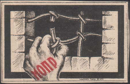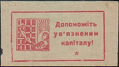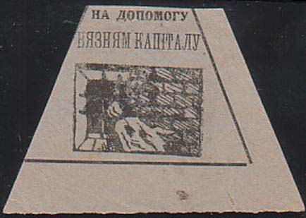 1930 1930(?) г. Трапеция разм. 72 х 50 мм. Одноцветная печать на тонкой светло-серой бумаге. В рамке в форме трапеции окно с решеткой и рука узника с платком. Сверху текст в две строки на украинском языке: «На помощь узникам капитала».