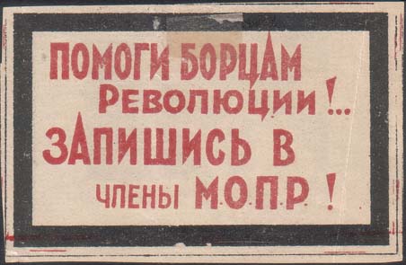 1924 1924(?) г. Разм. рамки 33,5 x 31 мм. Двухцветная печать на желтоватой бумаге. Зубц. 11 1/2. С клеем. В прямоугольной рамке в центре эмблема МОПР. Сверху текст: «На помощь». Внизу под рамкой продолжение текста в две строки: «Борцам мировой революции».